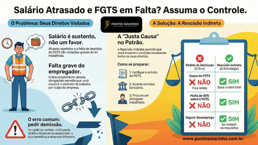 O que fazer com atraso de salário e FGTS? Se a empresa atrasa salários repetidamente ou não deposita o FGTS, o trabalhador tem direito a pedir a Rescisão Indireta do contrato de trabalho (Art. 483 da CLT). Isso funciona como uma “justa causa no patrão”. O empregado sai da empresa recebendo todas as verbas rescisórias (aviso prévio, multa de 40% do FGTS, férias + 1/3, 13º salário) como se tivesse sido demitido sem justa causa, além de poder pleitear indenização por danos morais.