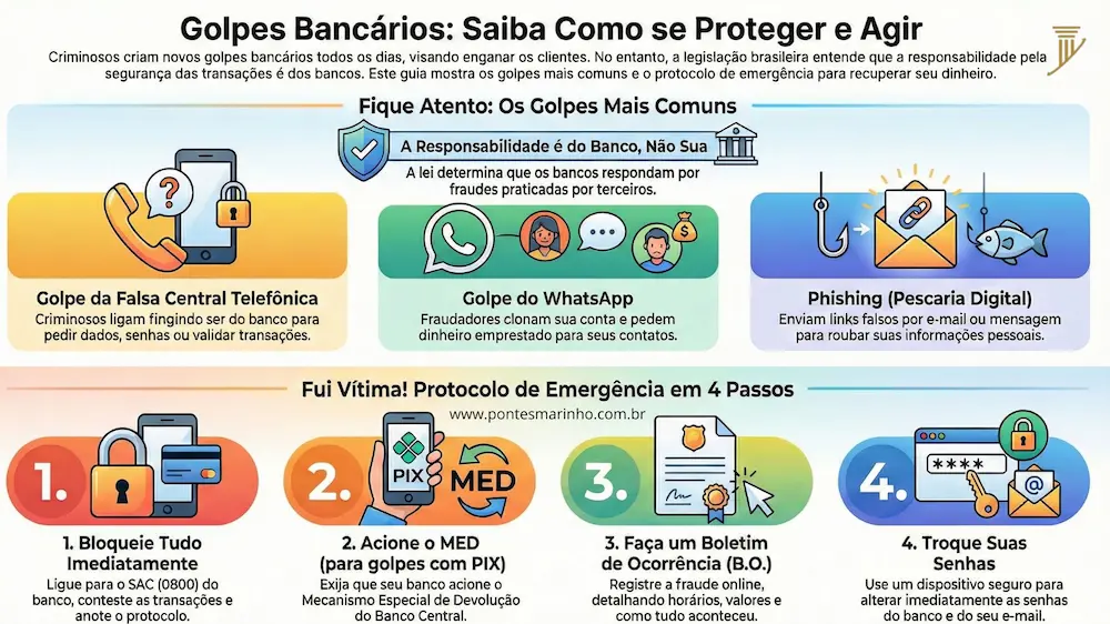 O que fazer em caso de golpe bancário? Imediatamente contate o banco para bloquear a conta e contestar as operações (anote o protocolo). Em seguida, faça um Boletim de Ocorrência (B.O.) detalhando a fraude. Se foi via PIX, acione o MED (Mecanismo Especial de Devolução) no seu banco. Caso o banco negue o ressarcimento, reúna as provas e entre com uma ação judicial pedindo a restituição em dobro (se aplicável) e danos morais, baseando-se na Súmula 479 do STJ e no Código de Defesa do Consumidor.