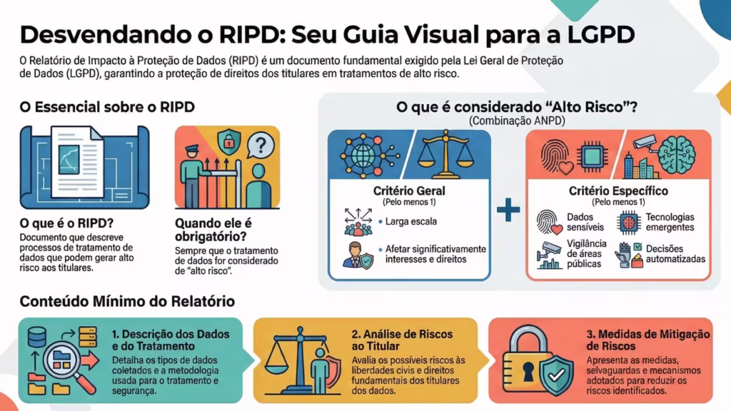 O RIPD, ou Relatório de Impacto à Proteção de Dados Pessoais, é um documento exigido pela LGPD que detalha todos os processos de tratamento de dados pessoais de uma organização que possam gerar alto risco para os titulares. Ele serve para demonstrar a conformidade, mitigando riscos e garantindo que a empresa adote medidas de segurança e boas práticas desde a concepção de um produto ou serviço. É uma análise proativa e aprofundada.