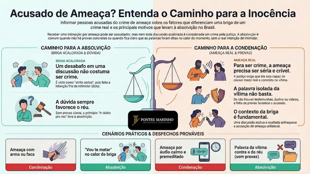 Quando o réu é inocentado de ameaça? O réu é inocentado do crime de ameaça (Art. 147 do CP) quando há falta de provas materiais (apenas a palavra da vítima contra a do réu), quando a ameaça foi proferida em momento de grave discussão e descontrole emocional (ausência de dolo específico de intimidar), ou quando a suposta ameaça não foi capaz de gerar temor real na vítima (crime impossível ou fato atípico). O princípio in dubio pro reo (na dúvida, a favor do réu) é frequentemente aplicado nesses casos.